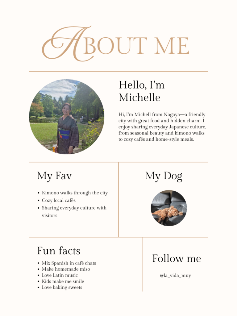 Hi, I’m Michell from Nagoya—a friendly city with great food and hidden charm. I enjoy sharing everyday Japanese culture, from seasonal beauty and kimono walks to cozy cafés and home-style meals.